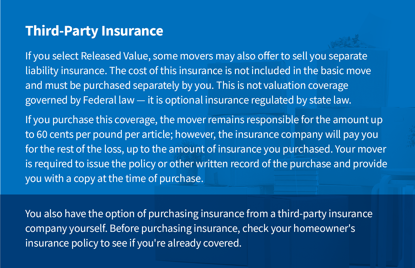 Under this option, movers are allowed to limit their legal responsibility to loss or damage to items of “extraordinary value”, meaning items that are valued more than $100 per pound (such as jewelry, china, or furs). However, if you specifically list these items on the shipping documents, your mover is still responsible for their safe delivery. Ask your mover for a written exp lanation of this limitation before your move.